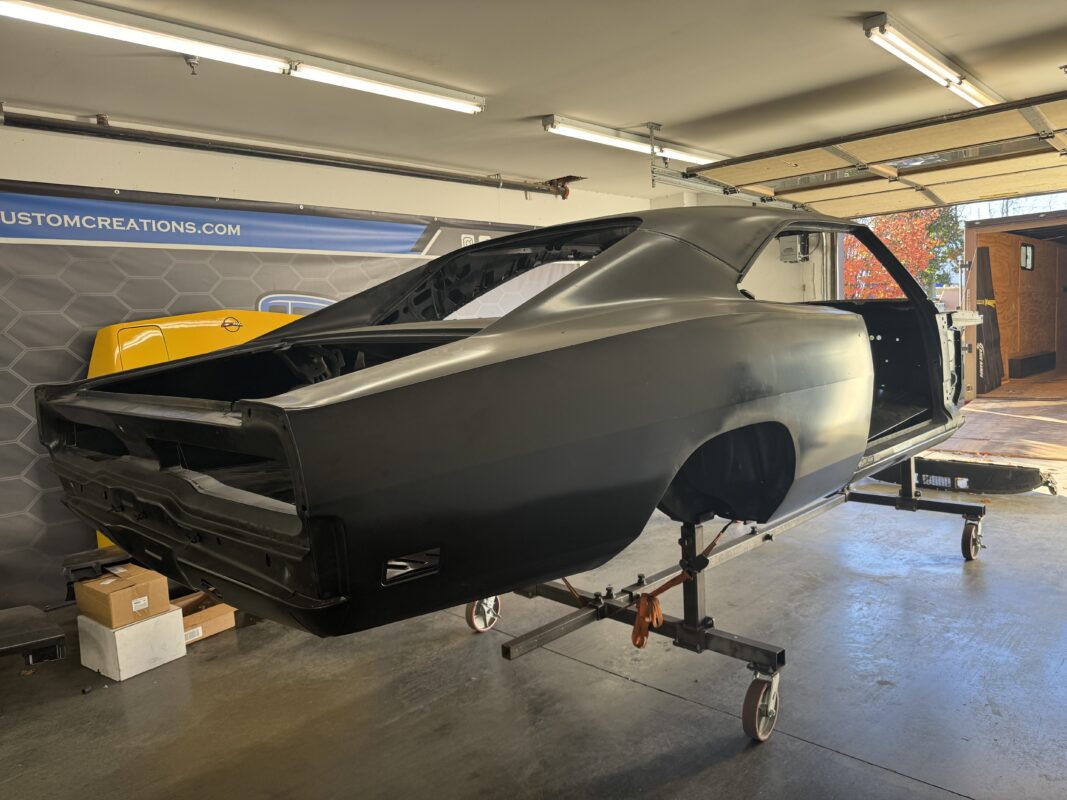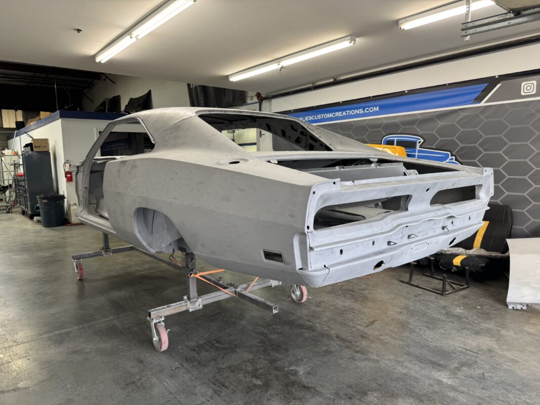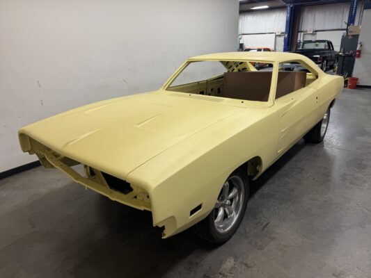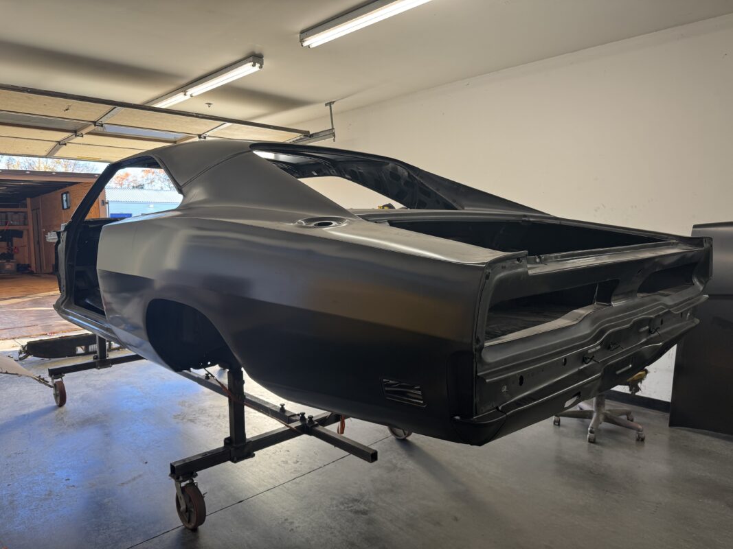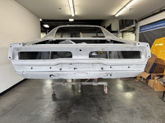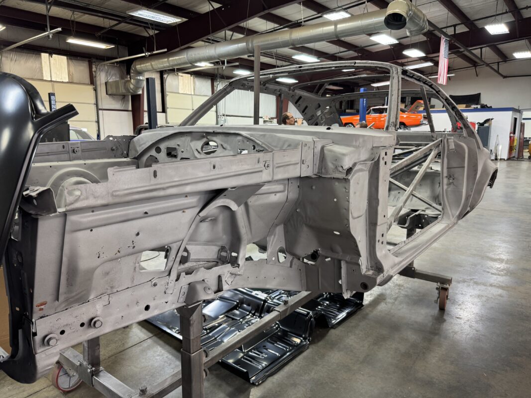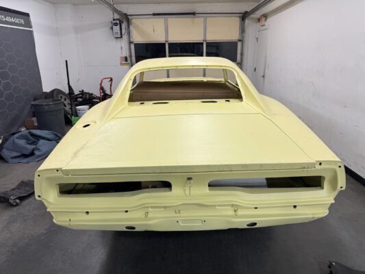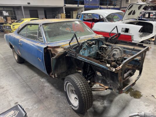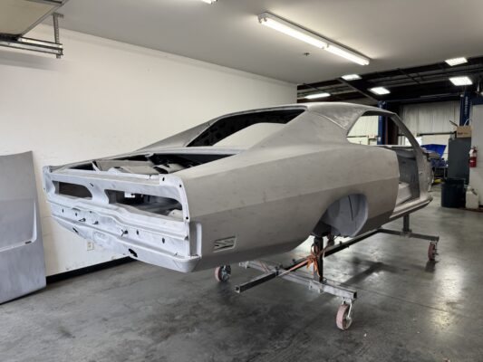 Skyler brought us his 1969 Charger for much needed rust repair. Stripped most all of the sheet metal off and replaced with all good AMD sheet metal. Blasted the body again after all sheet metal was replaced and locked it down with a Restoration grade epoxy.